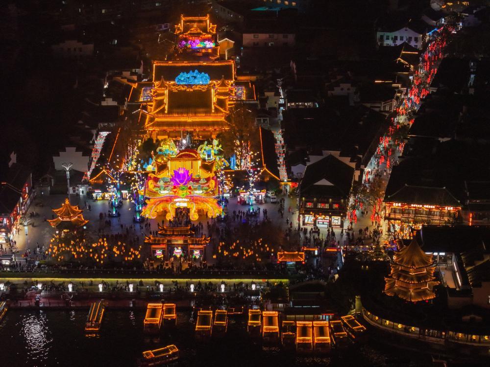 這是1月21日在江蘇南京夫子廟展區(qū)拍攝的燈組(無人機(jī)照片)。新華社記者 李博 攝