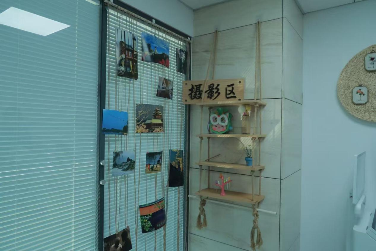穿過矯正中心的走廊,有一間技能培訓(xùn)室,里面擺滿了社區(qū)矯正對象學(xué)習(xí)制作的各類手工、繪畫、攝影作品,這里是為矯正人員提供知識技能培訓(xùn)的場所。