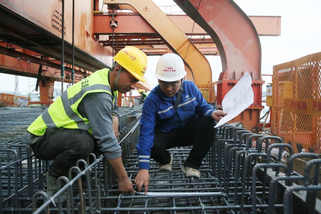 圖為吳基堅(jiān)(右)核對鋼筋綁扎參數(shù)。(中鐵二十五局供圖)