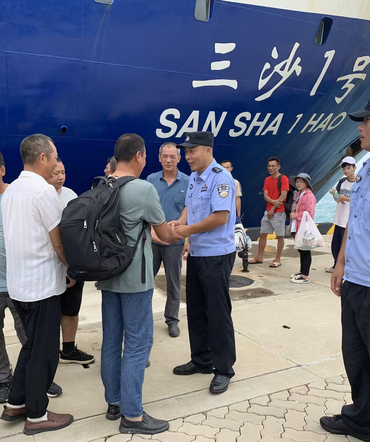 當天17時45分,最后一名務工人員登上“三沙1號”輪?!斗ㄖ稳請蟆酚浾呖吹?,汽笛聲中,他們揮動著粗糙又有力的手臂,透過船體玻璃窗門,向賀勝揮手感謝并道別,輪船載著務工人員沉甸甸的思鄉(xiāng)歸家之情,航往回家的方向。