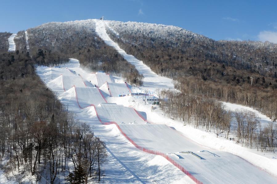 這是1月16日拍攝的位于亞布力滑雪場內(nèi)的第九屆亞冬會雪上賽區(qū)一角(無人機照片)。新華社記者 謝劍飛 攝