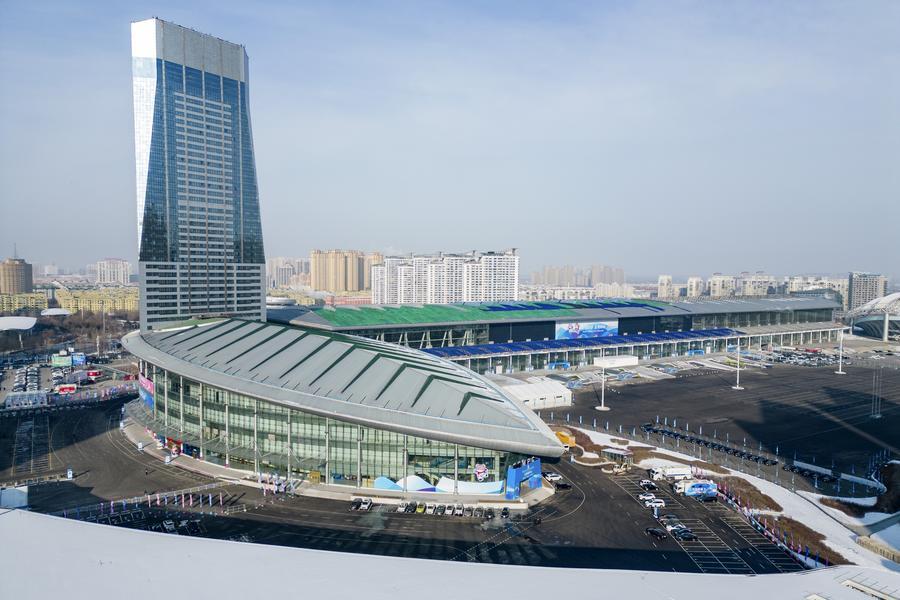 這是1月27日拍攝的哈爾濱國際會展體育中心(亞冬會開閉幕式場館)(無人機照片)。新華社記者 張濤 攝
