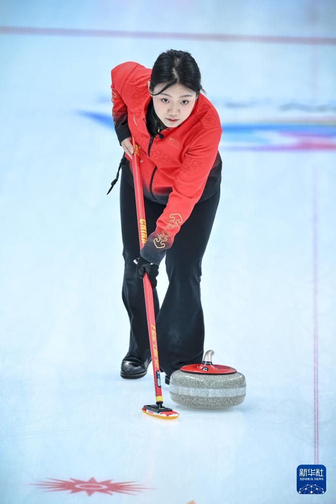 2月4日,中國(guó)隊(duì)選手韓雨在比賽中擲壺。