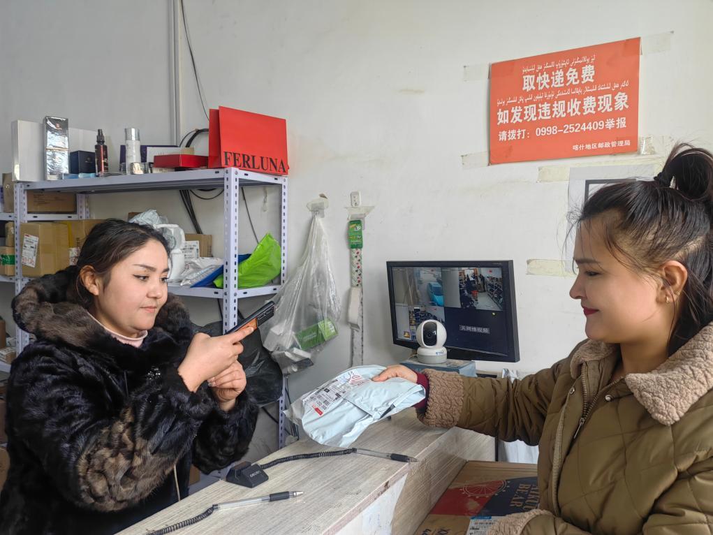 1月18日,在新疆喀什市荒地鄉(xiāng)一快遞代收點(diǎn),負(fù)責(zé)人塔吉尼沙·買買提力(左一)在為顧客掃描快遞單號(hào)。新華社記者蔡國棟 攝