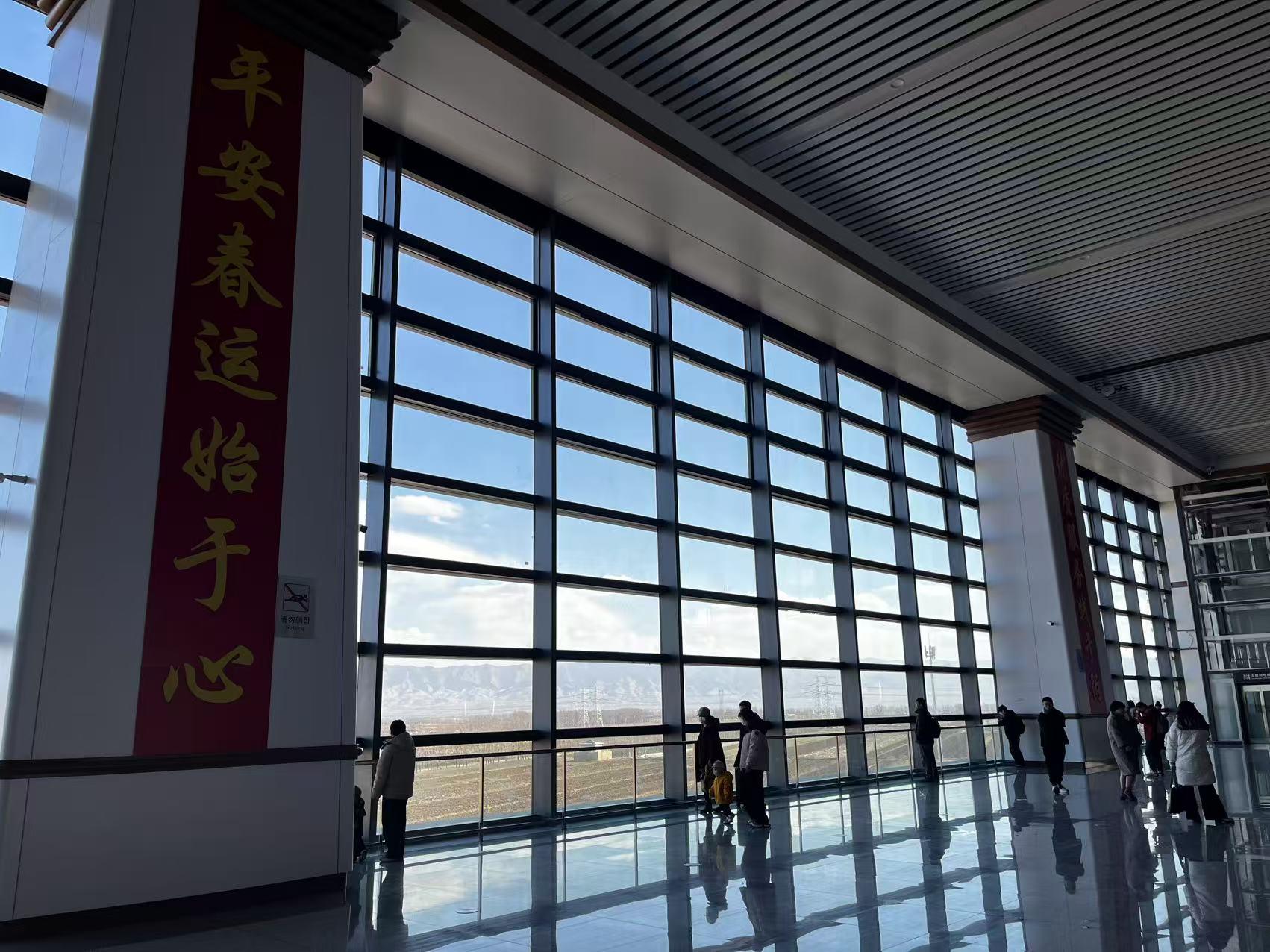 圖為乘客們在候車大廳倚窗而立,遠(yuǎn)眺銀裝素裹的山巒和廣袤無垠的大地。