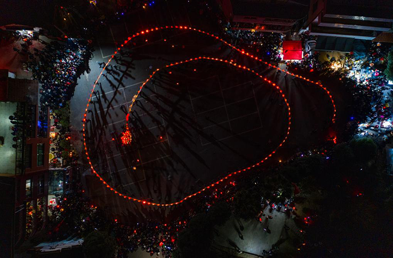當(dāng)晚6點(diǎn)開始,伴隨著熱鬧的鑼鼓聲,陣陣響亮的炮仗聲,一條由100多節(jié)板凳聚合而成的長龍流光溢彩,格外顯眼。