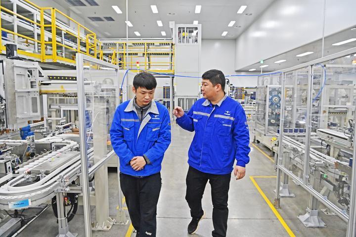 29歲的車間班組長劉洪恩在動力電池生產(chǎn)一線崗位已工作10年,是王東林的徒弟。師徒兩人調(diào)出近期生產(chǎn)數(shù)據(jù),對不同時段溫度、壓強等進(jìn)行對比分析,討論改進(jìn)工藝的方案?!斑@個崗位考驗對數(shù)據(jù)的分析和整理能力,每天都有細(xì)節(jié)可以改進(jìn),工作不枯燥?!眲⒑槎髡f。