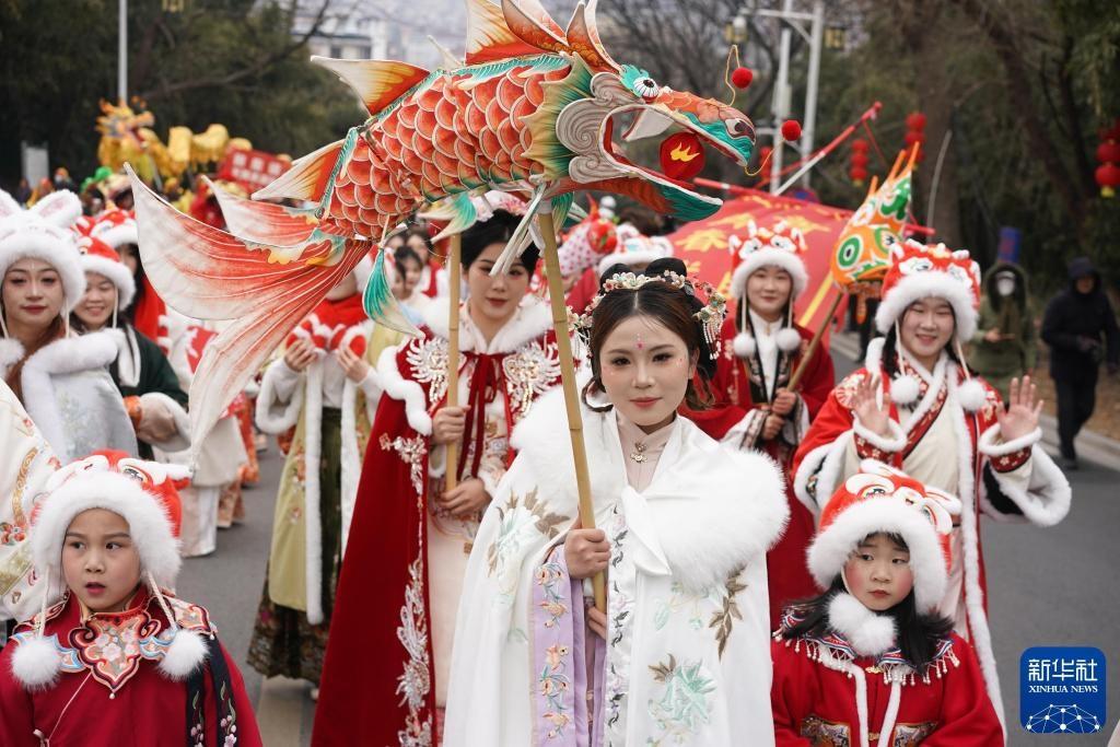 2025年2月11日,江蘇省盱眙縣舉行元宵節(jié)民俗匯演活動。這是展演隊伍在道路上巡游。新華社記者 季春鵬 攝