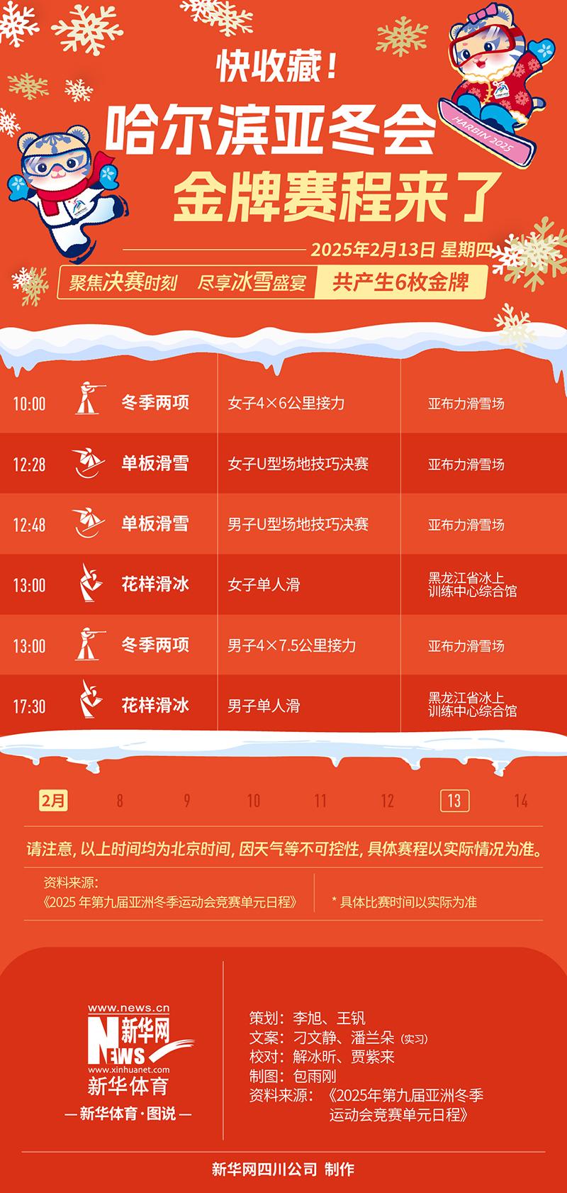 新華社哈爾濱2月12日電(記者許仕豪、王恒志)哈爾濱亞冬會13日將產(chǎn)生6塊金牌。在亞布力賽區(qū),單板滑雪U型場地技巧和冬季兩項接力賽將為雪上項目畫上句號。冰上方面,花樣滑冰將迎來男單、女單自由滑比賽。