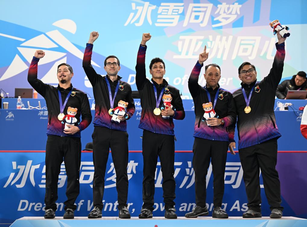 2月14日,菲律賓隊選手在頒獎儀式上。當(dāng)日,第九屆亞冬會男子冰壺頒獎儀式在哈爾濱舉行。新華社記者 趙子碩 攝