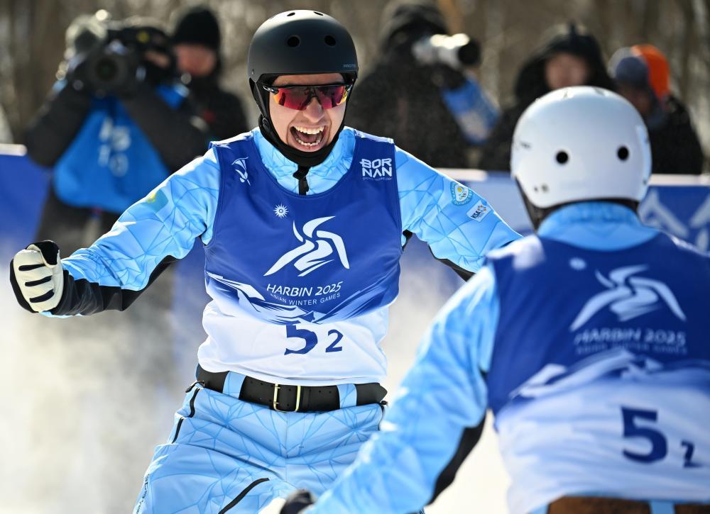 2月11日,哈薩克斯坦選手謝爾佐德·卡希爾巴耶夫(左)與羅曼·伊萬諾夫慶祝。最終,他們獲得冠軍。當(dāng)日,第九屆亞冬會自由式滑雪男子空中技巧雙人同步?jīng)Q賽在亞布力舉行。新華社記者 張晨霖 攝