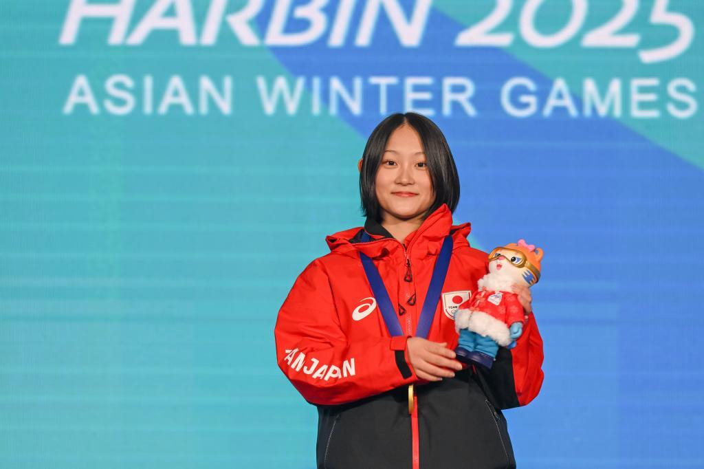 2月13日,日本選手清水笑良在頒獎儀式上。當(dāng)日,第九屆亞冬會單板滑雪女子U型場地技巧比賽決賽因大風(fēng)天氣取消,最終按照預(yù)賽成績決定獎牌歸屬。新華社記者 連振 攝
