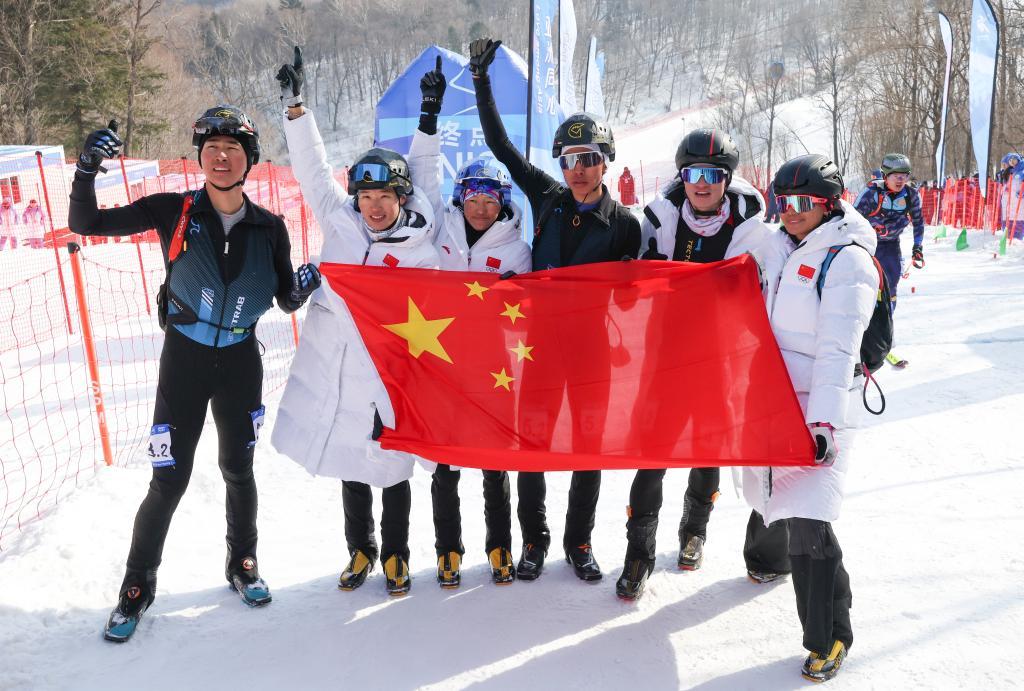2月12日,中國隊選手賽后合影慶祝。當(dāng)日,第九屆亞冬會滑雪登山混合接力決賽在亞布力舉行。中國組合次旦玉珍/布魯爾、于婧萱/畢禹新、索朗曲珍/劉建賓分別獲得冠、亞、季軍。新華社記者 楊青 攝
