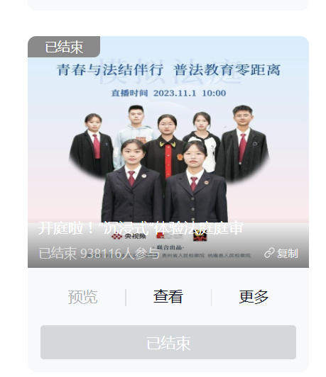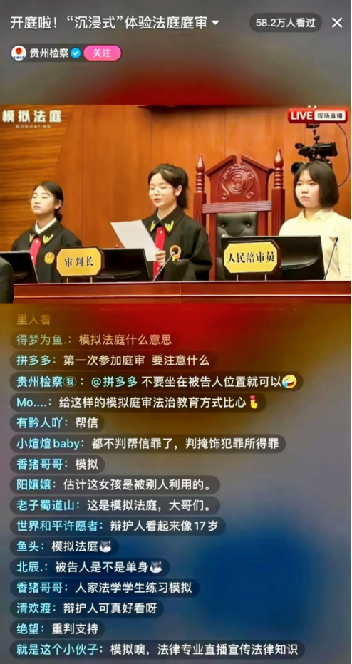 貴州省人民檢察院傾力打造“我是檢察官·直播間”原創(chuàng)普法IP,聯(lián)合黨政機(jī)關(guān)、學(xué)校等開(kāi)展普法活動(dòng),打造“檢察官+”普法宣傳模式,通過(guò)模擬法庭、專家講解、互動(dòng)答疑等形式,將司法實(shí)踐與線上直播結(jié)合,讓法律知識(shí)“活”起來(lái),群眾可以沉浸式體驗(yàn)“司法活動(dòng)”和“檢察辦案”等。