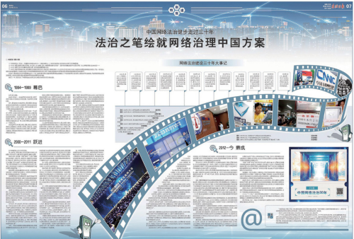 協(xié)調(diào)重要報(bào)道力量,采寫《中國(guó)網(wǎng)絡(luò)法治健步走過(guò)三十年法治之筆繪就網(wǎng)絡(luò)治理中國(guó)方案》報(bào)紙專版稿件,采用通版對(duì)開形式呈現(xiàn)。綜述文章雋永厚重,版面視覺效果恢弘大氣,圖文并茂地對(duì)《中國(guó)網(wǎng)絡(luò)法治三十年》報(bào)告進(jìn)行了全面解讀,獲得全網(wǎng)廣泛傳播。在該專版中,既集納傳統(tǒng)的報(bào)紙通訊、記者手記等文字報(bào)道,又運(yùn)用多種媒體元素、創(chuàng)新設(shè)計(jì)報(bào)紙版式。橫跨全版的“時(shí)光膠卷”一氣呵成,讓網(wǎng)絡(luò)法治建設(shè)三十年大事記躍然紙上。同時(shí),放置新媒體“門票”海報(bào),讓讀者沉浸式體驗(yàn)網(wǎng)絡(luò)法治建設(shè)的歷史成就。