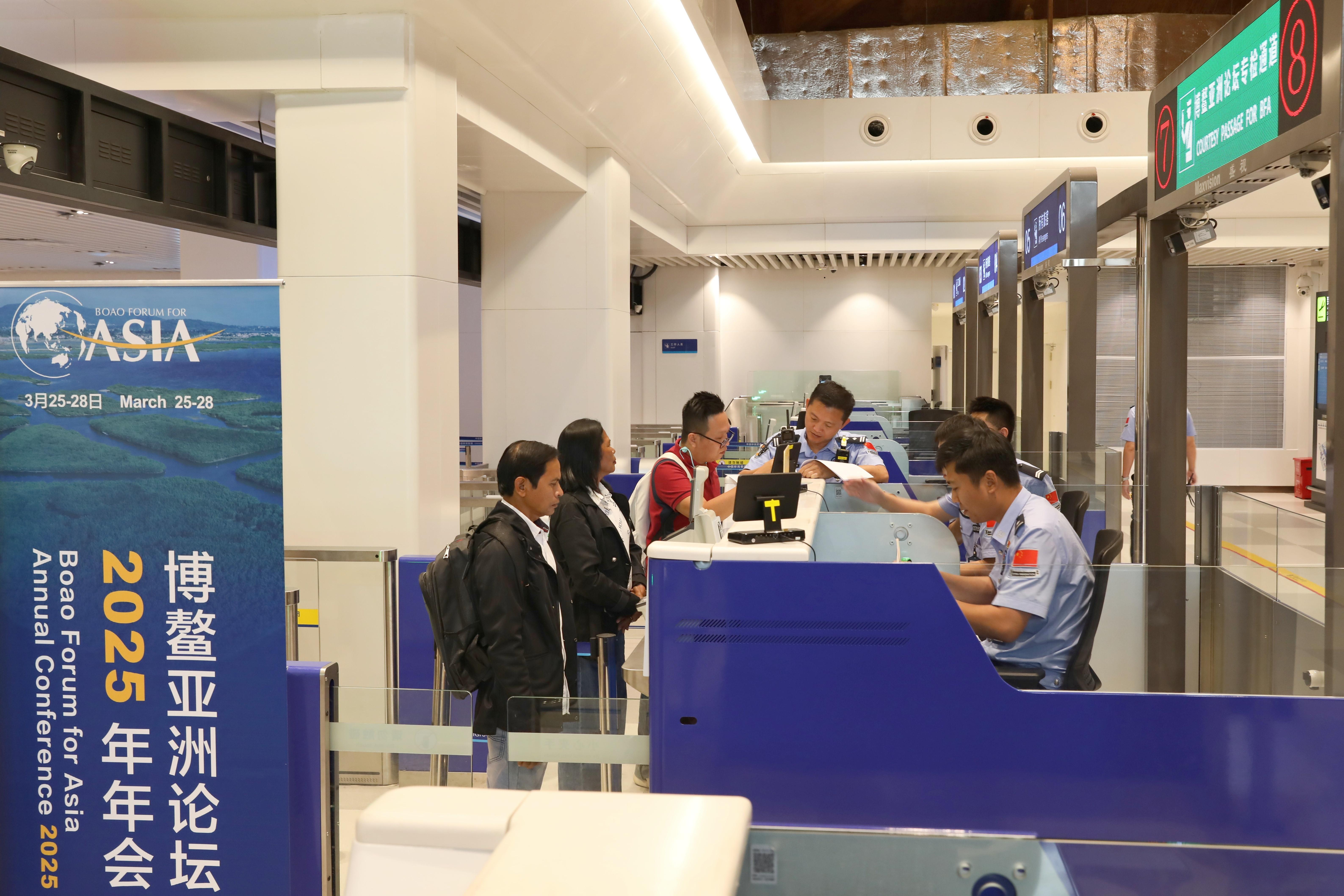 博鰲亞洲論壇2025年年會于3月25日至28日在海南博鰲舉行。自3月23日起,瓊海博鰲、??诿捞m、三亞鳳凰三大機(jī)場陸續(xù)迎來與會人員入境高峰,海南邊檢機(jī)關(guān)優(yōu)化勤務(wù)模式,主動靠前服務(wù),努力為入境與會人員提供便捷高效的口岸通關(guān)保障。