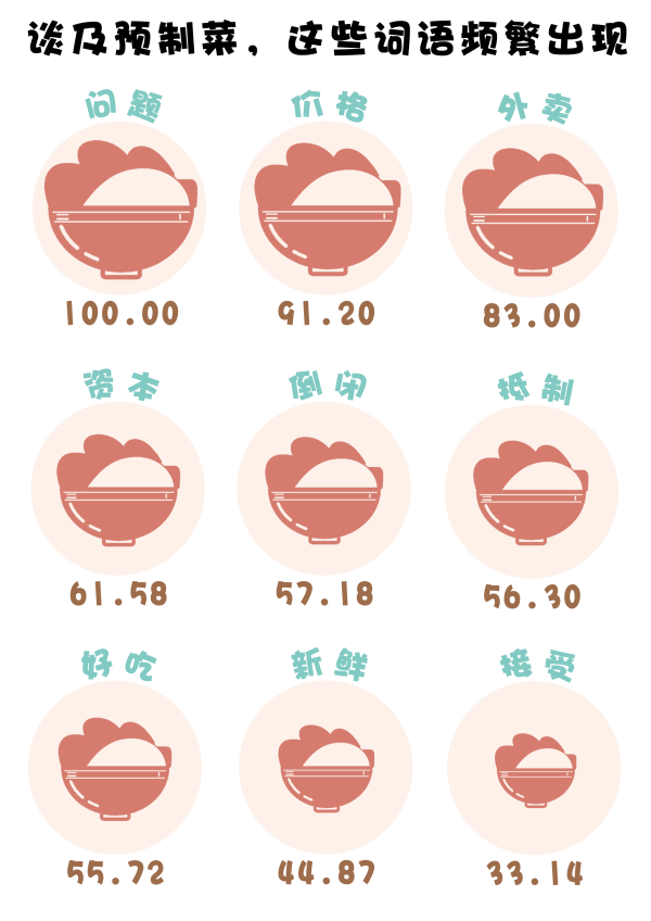 (數(shù)據(jù)來源:選取嗶哩嗶哩視頻《餐館倒閉300萬家,預(yù)制菜祭天,集體退圈的商家,人民的勝利》下的3950條一級評論及彈幕,做分詞及歸一化處理,進(jìn)行分詞后將熱度最高的詞語規(guī)定為100)