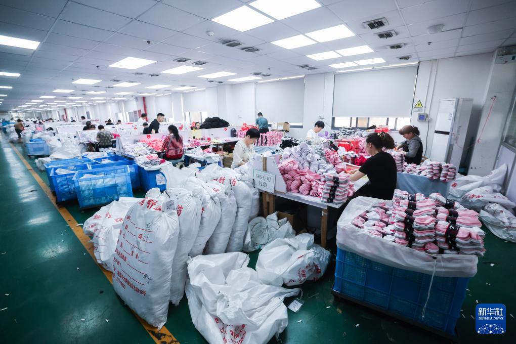 4月10日,在諸暨市緣錦針織有限公司的流水線上,工人在打包出口國外市場的襪子。