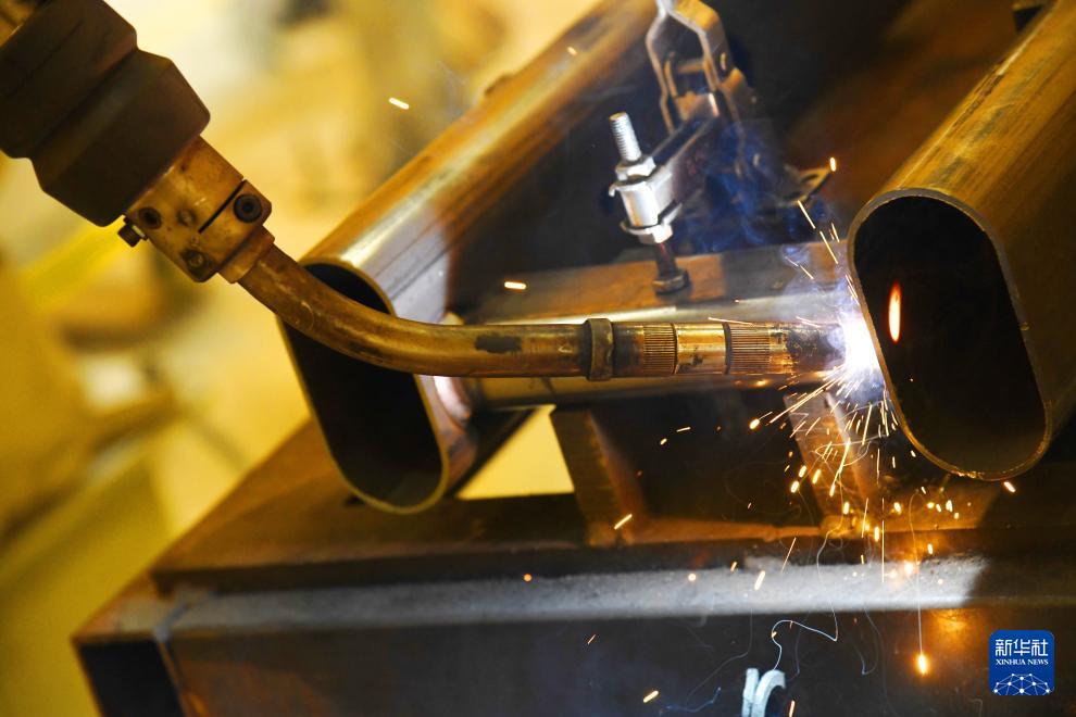 青島英派斯健康科技股份有限公司智慧工廠內(nèi)的自動激光焊接機(jī)器人在作業(yè)(4月22日攝)。