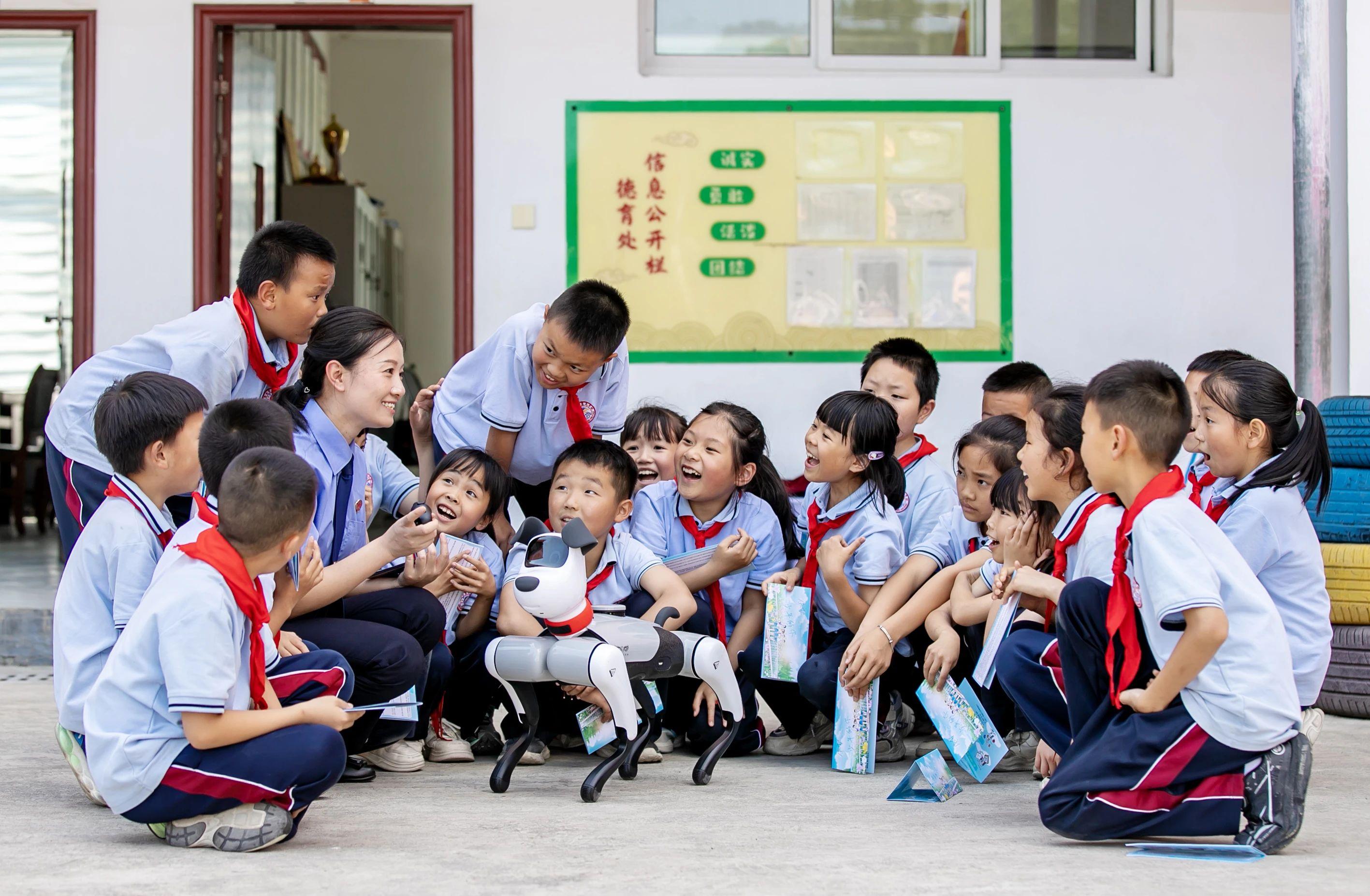 圖為檢察干警在惠風(fēng)學(xué)校利用智能機(jī)器狗“妞妞”給學(xué)生宣講未成年人保護(hù)法。