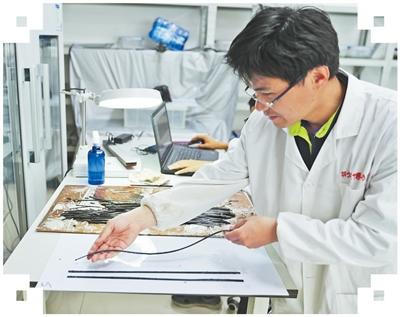 簡(jiǎn)牘發(fā)掘、保護(hù)和修復(fù)是一場(chǎng)與時(shí)間的賽跑?!皠偝鐾恋闹窈?jiǎn)軟得像面條,非常脆弱,接觸空氣后極易氧化變黑,可能導(dǎo)致文字瞬間消失?!笔Y魯敬說(shuō),在龍會(huì)河楚墓發(fā)掘中,他們采用“整體提取法”:以薄塑料板作“手術(shù)刀”,木托板為“擔(dān)架”,將整堆簡(jiǎn)牘托起,并快速送往荊州文物保護(hù)中心。