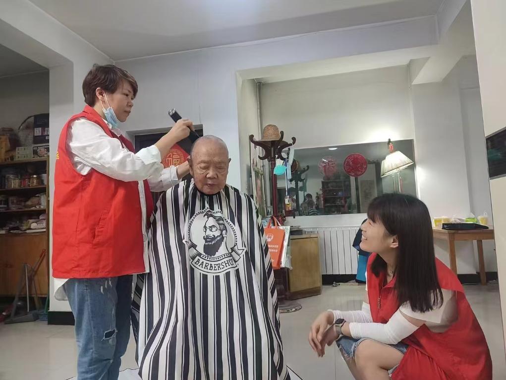 西安市碑林區(qū)黃雁社區(qū)的工作人員和志愿者上門為留守老人提供剪發(fā)服務(wù)。(受訪者供圖)