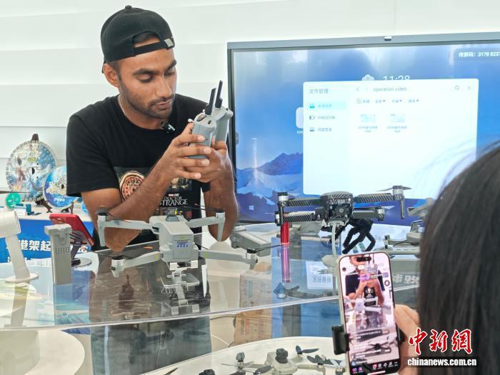 8月26日,在中國(鄂州)跨境電商產(chǎn)業(yè)園的直播中心,來自巴基斯坦的洋主播“阿布”正在TikTok直播間向北美消費者推薦無人機。史元豐 攝