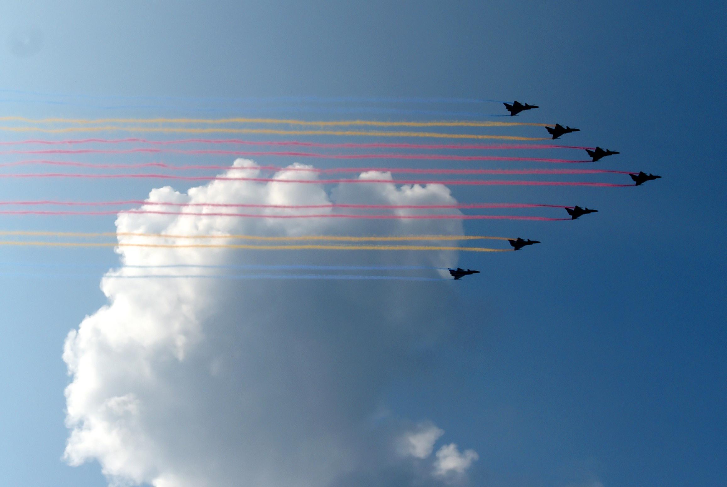 教練機(jī)梯隊(duì)飛過(guò)天安門(mén)廣場(chǎng)上空。