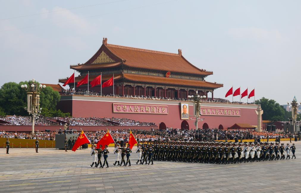 9月3日,紀(jì)念中國人民抗日戰(zhàn)爭暨世界反法西斯戰(zhàn)爭勝利80周年大會(huì)在北京隆重舉行。這是國旗護(hù)衛(wèi)隊(duì)在行進(jìn)中。新華社記者 魏培全 攝