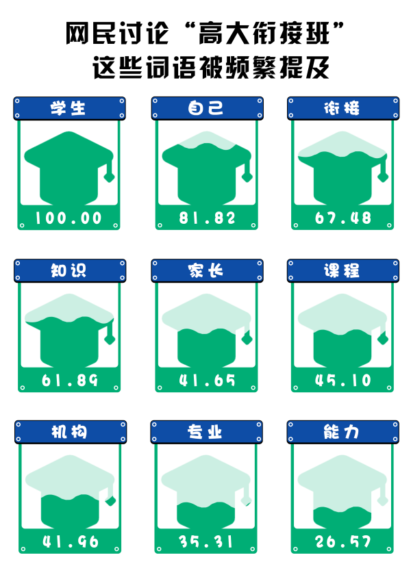 (數(shù)據(jù)來(lái)源:選取知乎話題“培訓(xùn)機(jī)構(gòu)推出‘高大銜接班’,為大一新生補(bǔ)習(xí)大學(xué)知識(shí),暑假補(bǔ)課真能‘贏在大學(xué)起跑線’嗎?”下的172個(gè)回答,做分詞及歸一化處理,進(jìn)行分詞后將熱度最高的詞語(yǔ)規(guī)定為100)
