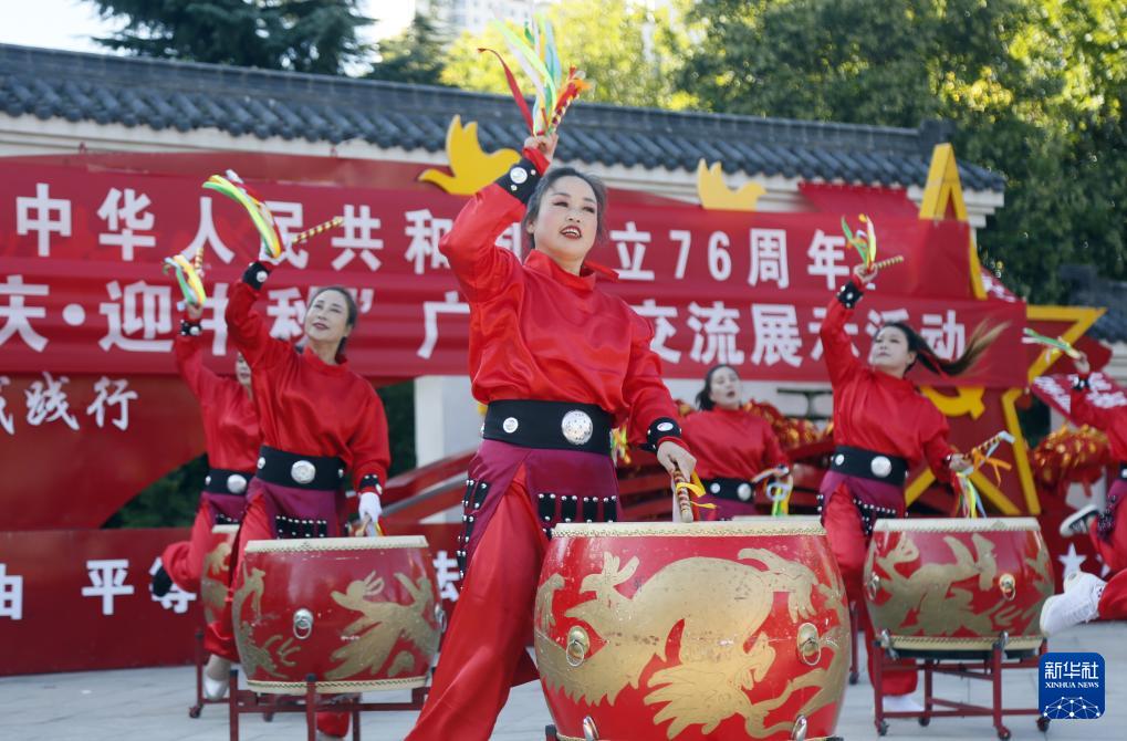 9月25日,在河南省洛陽市汝陽縣劉伶廣場,汝陽縣牡丹藝術(shù)團在表演音樂鼓《中華魂》。