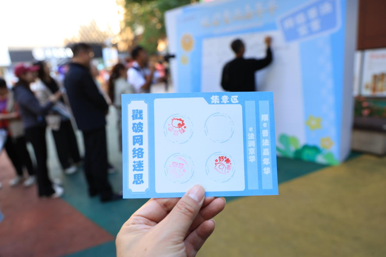 “網(wǎng)購維權(quán)小屋”前的“考題”,緊扣《消費(fèi)者權(quán)益保護(hù)法》《電子商務(wù)法》,貼近日常消費(fèi)場景;“反詐先鋒能量站”里,參與者通過判斷真?zhèn)卫鄯e打卡印章,參與市民紛紛表示“以后會多留心”;“陷阱獵手:箭破迷霧”中,游客張弓搭箭,射向各類網(wǎng)絡(luò)陷阱標(biāo)靶;“法治飛行棋”區(qū)域則將“個(gè)人信息保護(hù)”“網(wǎng)絡(luò)謠言識別”等知識點(diǎn)化作關(guān)卡。
