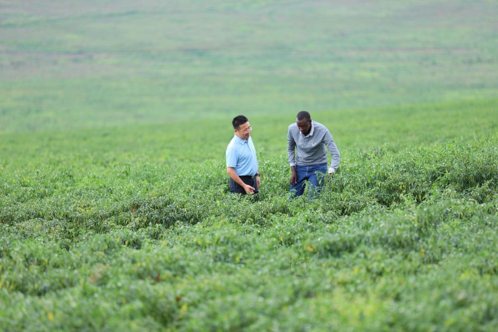 2025年5月22日,在盧旺達(dá)加紹拉農(nóng)場(chǎng),湘農(nóng)國(guó)際非洲商務(wù)代表與當(dāng)?shù)剞r(nóng)業(yè)技術(shù)員查看辣椒長(zhǎng)勢(shì)。新華社記者吉莉攝
