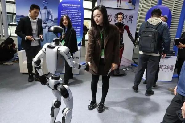 2024年“互聯(lián)網(wǎng)之光”博覽會上,觀眾與人形機器人互動。
