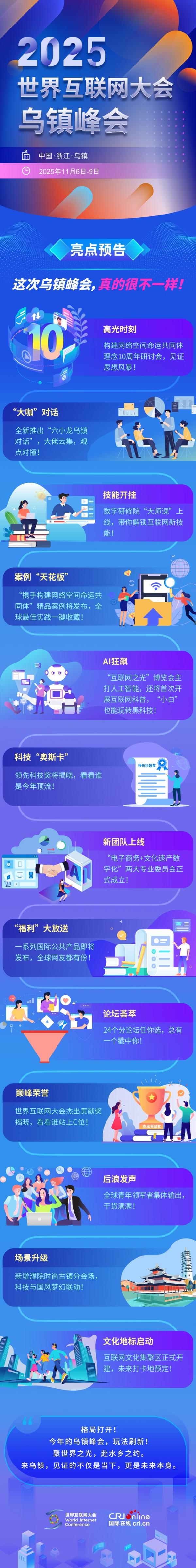 當(dāng)千年文明對(duì)話前沿科技,一場(chǎng)關(guān)于數(shù)字未來(lái)的無(wú)限想象,正在這里展開(kāi)。這是一場(chǎng)全球互聯(lián)網(wǎng)的頂級(jí)盛會(huì),更是一次未來(lái)之旅。今年“玩法”全面升級(jí),更潮、更酷、更有料!鎖定2025年烏鎮(zhèn)峰會(huì),一起定義未來(lái)!