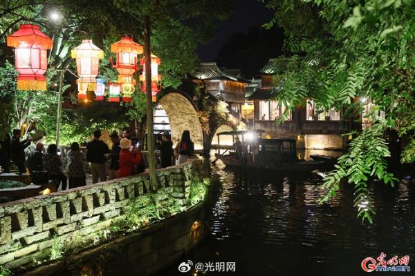 隨著夜幕降臨,河道兩岸燈光點綴,烏篷船緩緩劃過,水面映射出絢麗色彩。當暮色浸染白墻黛瓦,烏鎮(zhèn)從素簡水墨畫蛻變?yōu)榱鞴庖绮实臄?shù)字夢境。