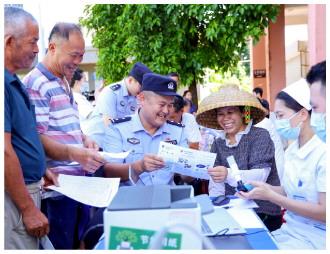 近日,海南省公安廳反走私和海岸管理總隊(duì)、總隊(duì)第一支隊(duì)聯(lián)合省老年病醫(yī)院在??谑醒葚S鎮(zhèn)演海村開展“健康惠民義診+反走私普法宣傳”警醫(yī)共建活動(dòng)。圖為民警向村民發(fā)放反走私宣傳材料。(本報(bào)通訊員 代龍超 攝)