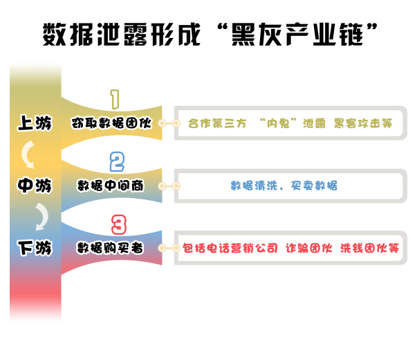 在個人信息“黑灰產(chǎn)市場”中,上、中、下游分工明確、緊密配合,構(gòu)成完整犯罪鏈條。首先,竊取數(shù)據(jù)團伙作為上游“供貨商”,通過與第三方及內(nèi)部人員合作、使用黑客技術(shù)等方式拿到原始數(shù)據(jù)。其次,處于中游的“數(shù)據(jù)中間商”承接上游“供貨商”提供的原始數(shù)據(jù),并對其進行清洗,同時尋找電話營銷公司、詐騙團伙等下游“買家”。最后,下游“買家”會將清洗后的數(shù)據(jù)轉(zhuǎn)化為非法獲利的工具,通過定向?qū)嵤┻`法犯罪行為達到斂財目的,由此實現(xiàn)犯罪鏈條規(guī)?;?、專業(yè)化的閉環(huán)。