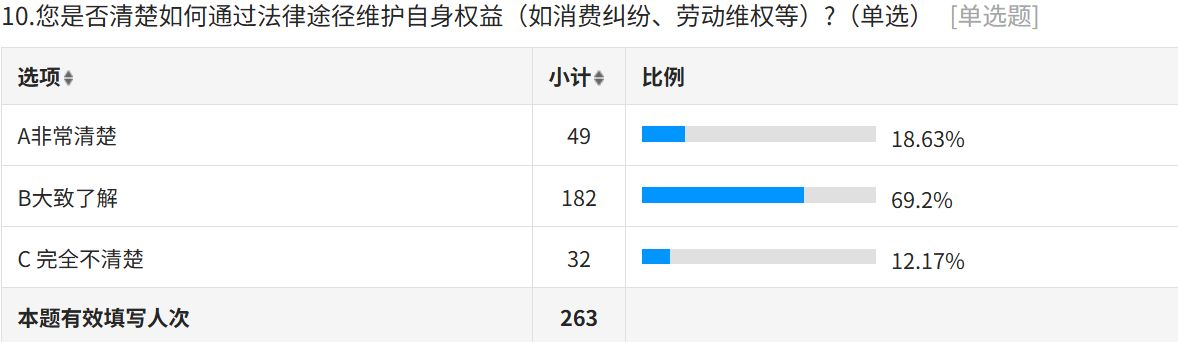 圖一:“您是否清楚如何通過(guò)法律途徑維護(hù)自身權(quán)益”問(wèn)題的調(diào)查問(wèn)卷結(jié)果