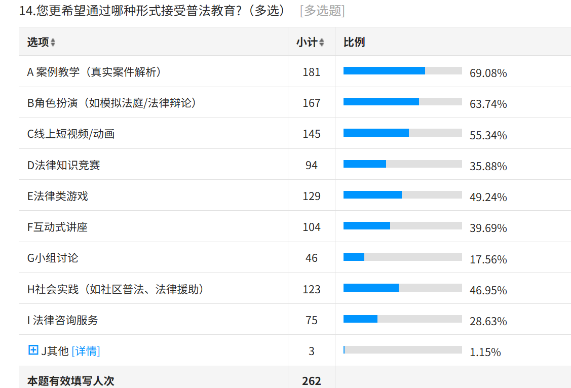 其次,高校普法實(shí)踐模式覆蓋面低。大概百分之四十多的學(xué)生反饋缺乏普法實(shí)踐,渴望在實(shí)踐中體驗(yàn)和運(yùn)用法律知識(shí)。當(dāng)前高校普法教育有的采取了模擬法庭、法律診所、實(shí)地調(diào)研等實(shí)踐教學(xué)方式,但局限于資源及其他原因,存在形式化、一次性的問(wèn)題,沒(méi)有真正達(dá)到提高學(xué)生法律實(shí)踐能力的目的。