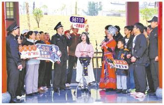 圖為廣西壯族自治區(qū)玉林市陸川縣公安局民警近日來(lái)到文昌公園,與身穿民族服飾的歌手一同唱響禁毒、反詐主題山歌。 阮琬珍 攝