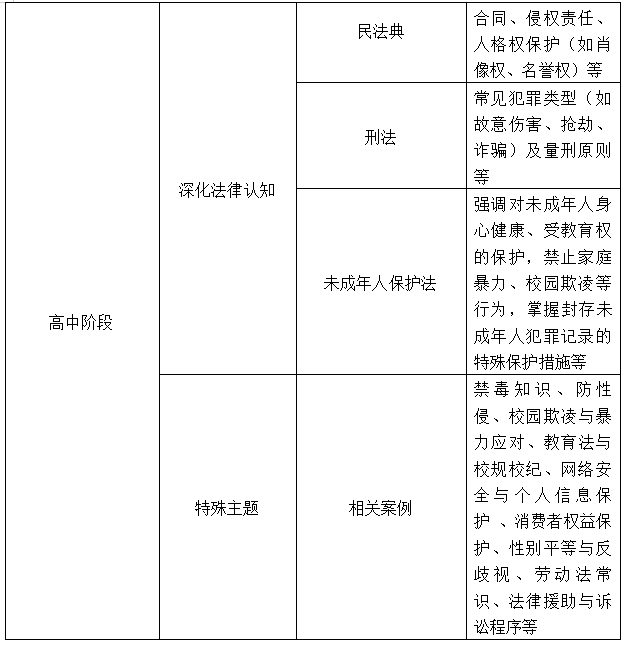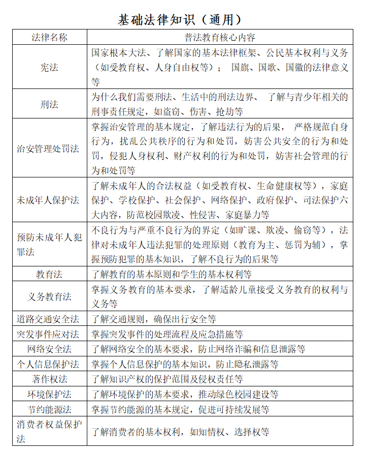 普法教育應(yīng)針對(duì)不同年齡段的學(xué)生開(kāi)展有實(shí)效的普法教育,充分考慮不同年齡段的學(xué)生特點(diǎn),提供定制化的普法教育內(nèi)容。普法內(nèi)容必須保持時(shí)效性與前瞻性,普法教育者應(yīng)及時(shí)關(guān)注最新的法律法規(guī)和司法實(shí)踐成果,并將其融入到校園普法教育中,為學(xué)生提供最新、最準(zhǔn)確的法律知識(shí)。以下是學(xué)校中小學(xué)生普法教育核心內(nèi)容清單之一,供參考。
