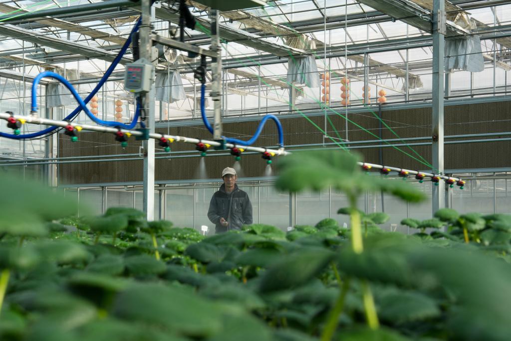 在青海省西寧市湟中區(qū),工作人員正在利用水肥一體化設(shè)備給草莓種苗澆水。新華社記者杜笑微 攝