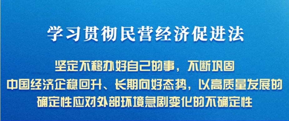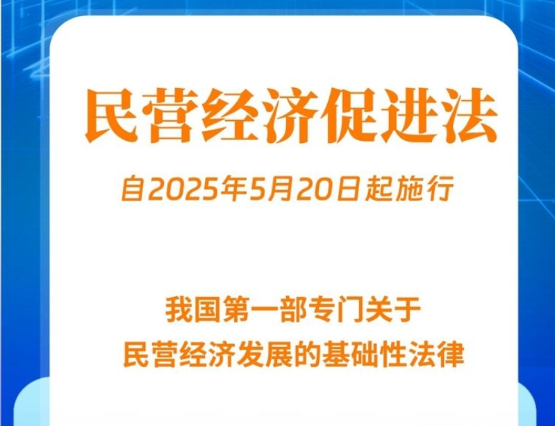 民營經(jīng)濟(jì)促進(jìn)法將于今年5月20日起施行。作為我國第一部專門關(guān)于民營經(jīng)濟(jì)發(fā)展的基礎(chǔ)性法律,民營經(jīng)濟(jì)促進(jìn)法的制定出臺(tái)是貫徹落實(shí)黨的二十屆三中全會(huì)決定和習(xí)近平總書記在2月17日民營企業(yè)座談會(huì)上重要講話精神的重大舉措,是貫徹習(xí)近平法治思想、習(xí)近平經(jīng)濟(jì)思想的生動(dòng)實(shí)踐……...[詳情]