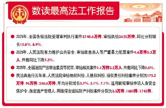 報(bào)告著重強(qiáng)調(diào)“恪守公平正義”,圍繞“保障高水平安全”“服務(wù)高質(zhì)量發(fā)展”“守護(hù)高品質(zhì)生活”“助力高水平開放”等方面,回顧了2025年人民法院各項(xiàng)工作。