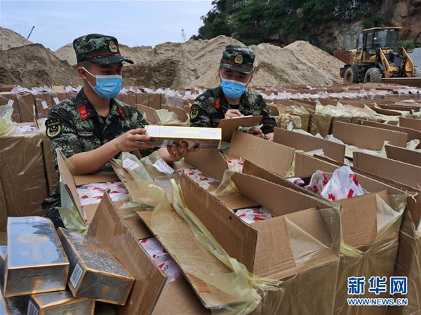 海警執(zhí)法員點驗涉案走私香煙(6月1日攝)。 新華社發(fā)