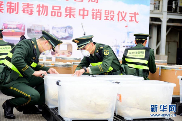 海警執(zhí)法員點驗涉案制毒物品(2月25日攝)。 新華社發(fā)