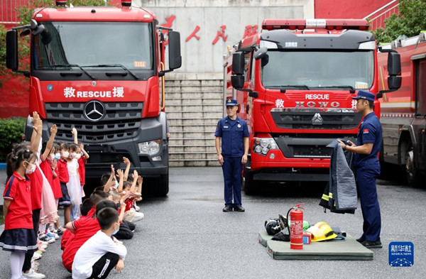 “六一”兒童節(jié)臨近,湖南省資興市消防救援大隊舉辦開放日活動,資興市小紅花幼兒園30余名小朋友走進消防站,參觀了解消防裝備,學(xué)習(xí)消防知識,增強安全意識。新華社發(fā)(李科攝)