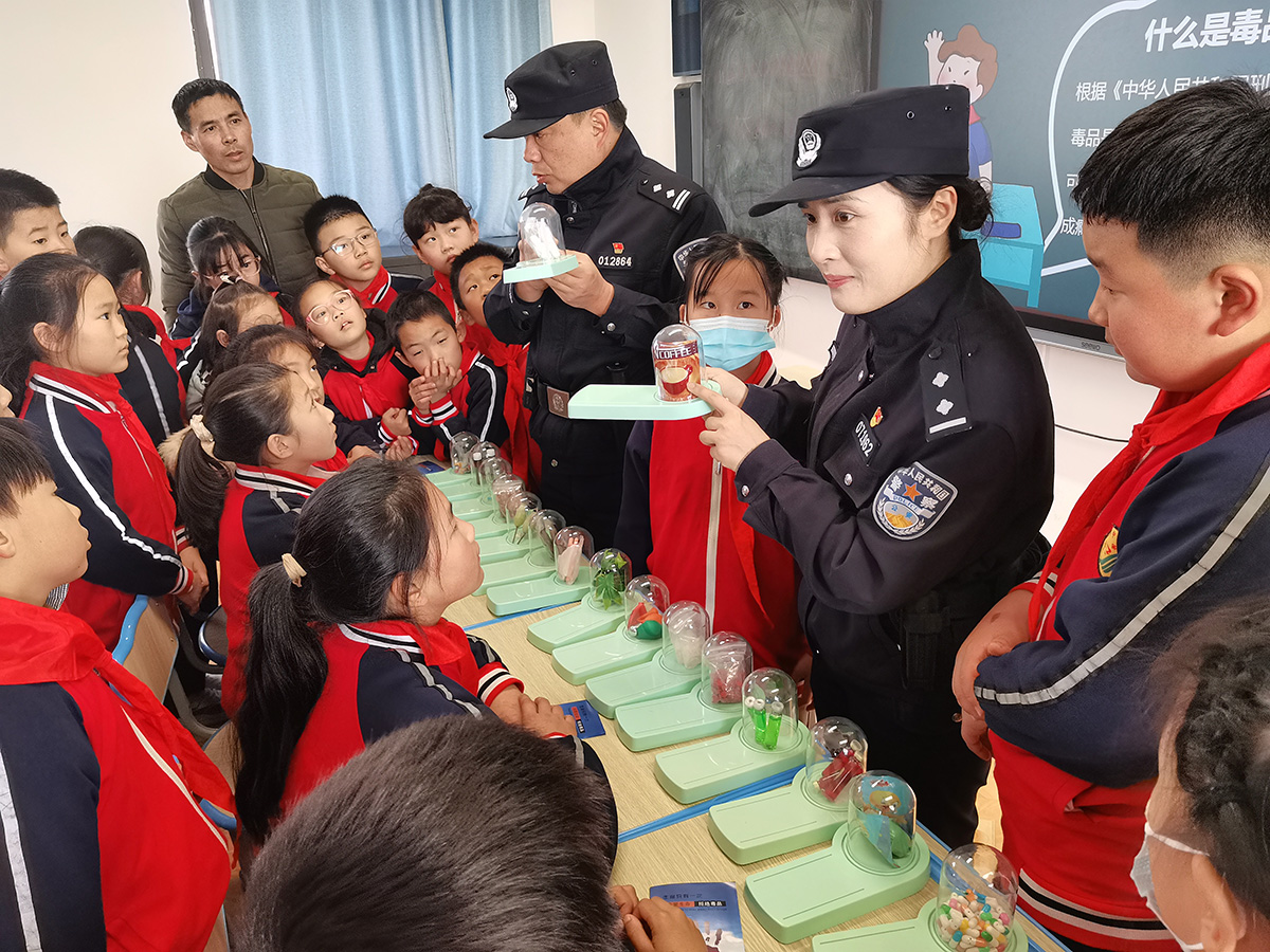 連日來,安徽省南陵縣公安局組織民警進(jìn)校園開展禁毒宣傳,增強(qiáng)中小學(xué)生“珍愛生命、遠(yuǎn)離毒品”意識(shí)。圖為近日,民警向南陵縣三里鎮(zhèn)中心小學(xué)學(xué)生介紹新型毒品的危害。