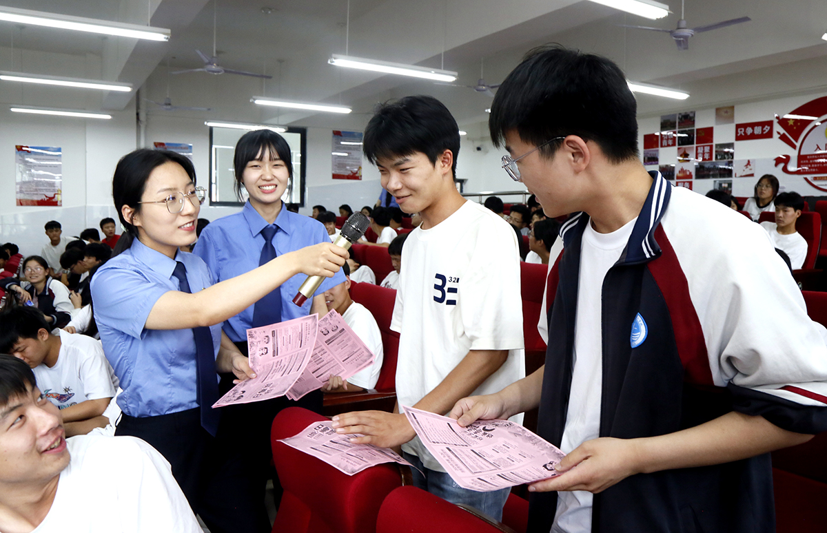 河南省汝陽縣人民檢察院近日組織干警到縣中等專業(yè)學(xué)校開展“無毒青春 健康生活”活動(dòng),切實(shí)提高大家識(shí)毒、防毒、拒毒意識(shí)與能力,保障校園良好學(xué)習(xí)、生活環(huán)境。圖為干警與學(xué)生開展禁毒知識(shí)問答互動(dòng)活動(dòng)。